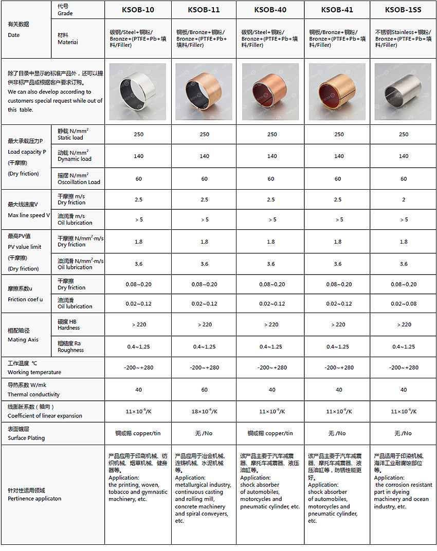 According to the different working conditions and environmental protection, there are steel backing, bronze backing, stainless steel backing can be chosen, different type of alloy can be chosen, the PTFE layer with polymer filler and it is lead free, the Surface tin or copper plating. product range includes KSOB-10、KSOB-11、KSOB-40、KSOB-41、KSOB-1SS.